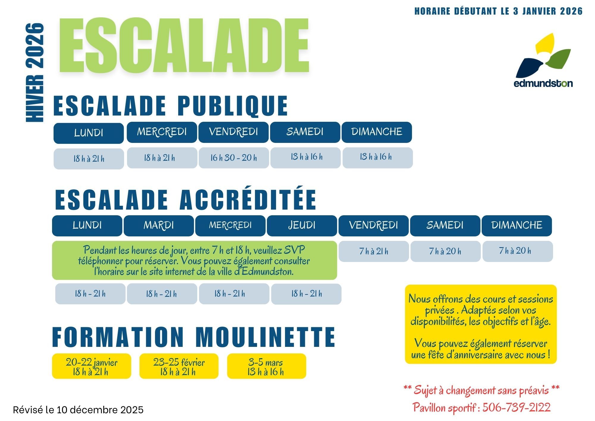 L'escalade vous intéresse ? Voici l'horaire du plateau d'escalade.